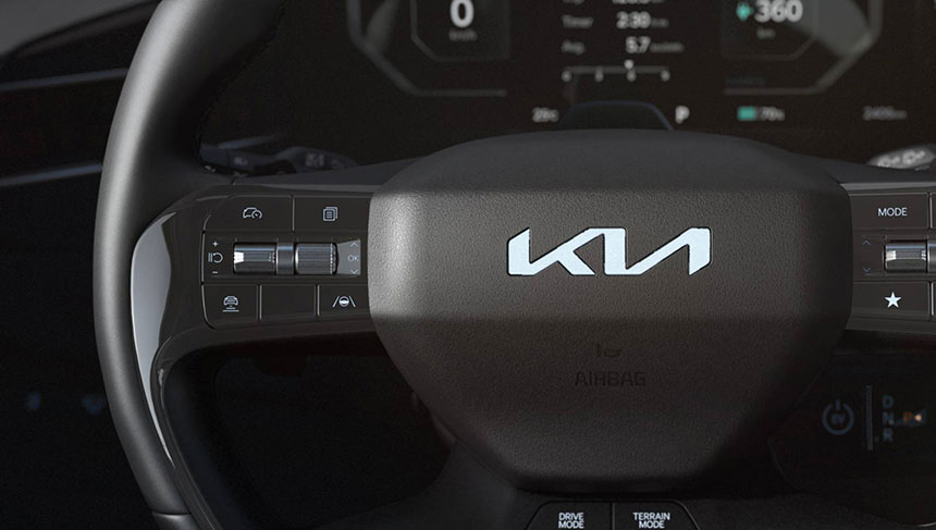 Während der Fahrt bringen integrierte LEDs das Kia-Emblem in der Mitte des Lenkrads zum Leuchten. Ein echter Hingucker, der den stilvollen Innenraum des neuen EV9 GT-line perfekt abrundet.